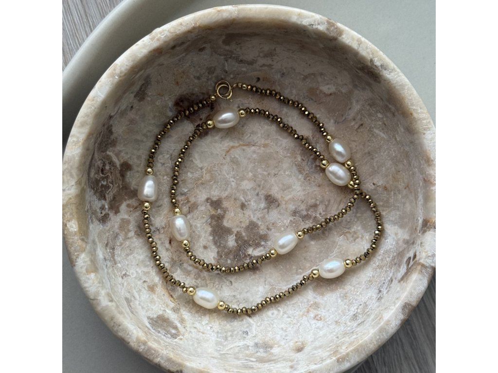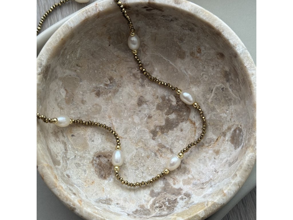 Golden Pearl Classic je elegantní náhrdelník ze zlatých korálků doplněný bílými říčními perlami.
