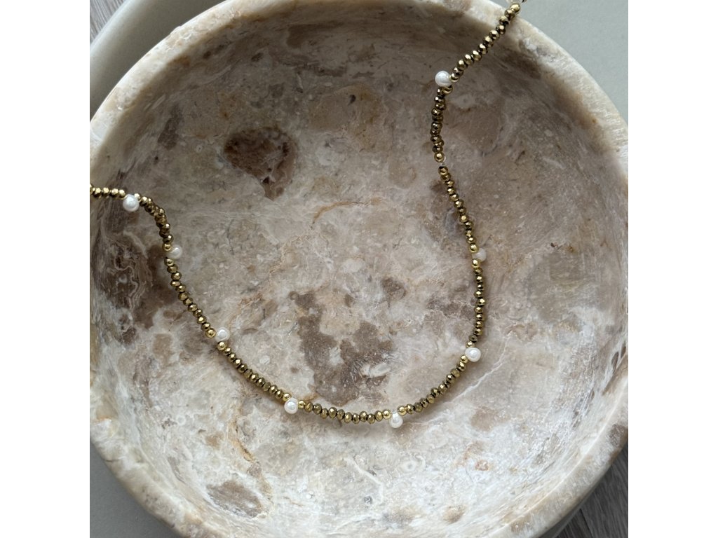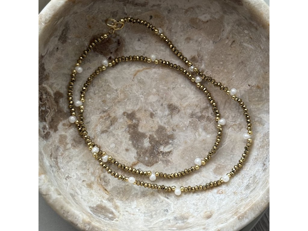 Golden Pearl Shine je elegantní náhrdelník z drobných zlatých korálků doplněný jemnými bílými říčními perlami.