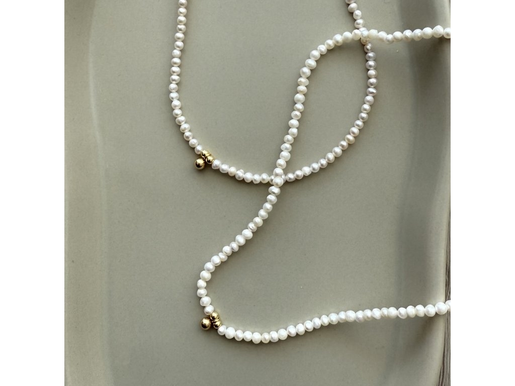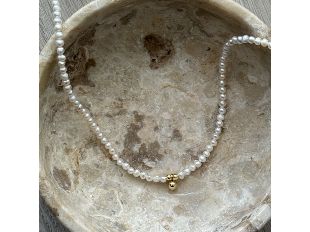 Mini Gold Ball je jemný perlový náhrdelník tvořený drobnými bílými říčními perlami a malou zlatou kuličkou uprostřed. Minimalistický, elegantní a nadčasový doplněk pro každý den.