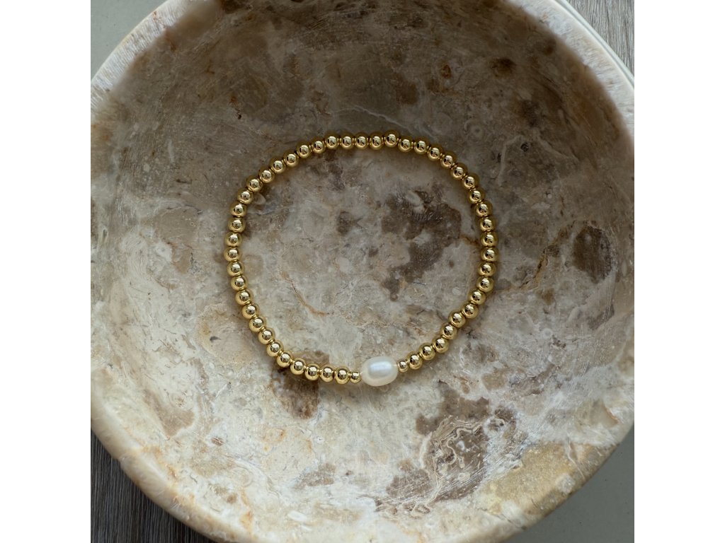 One pearl náramek ze zlatých korálků doplněný výraznou říční perlou. Elegantní kousek, který se hodí ke každodennímu nošení i ke slavnostním příležitostem.