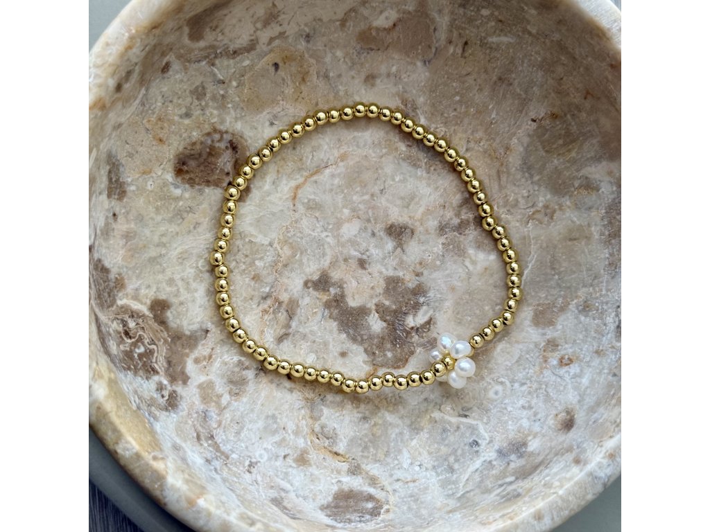 Pearl Blossom je jemný náramek ze zlatých korálků s květinovým detailem z bílých říčních perel. Skvěle se hodí na běžné nošení i slavnostní příležitosti. Díky decentnímu designu se dobře kombinuje s dalšími šperky.