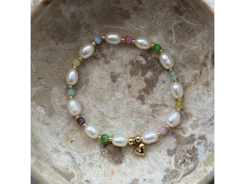 Pearl Rainbow Heart je náramek z říčních perel doplněný barevnými skleněnými korálky a zlatými prvky z nerezové oceli.