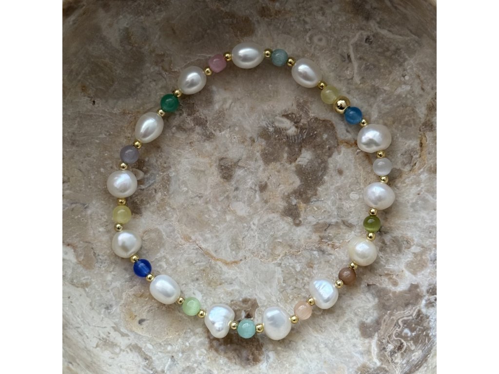 Pearl & Rainbow Large je náramek z větších bílých říčních perel doplněný barevnými skleněnými korálky a zlatými prvky z nerezové oceli.