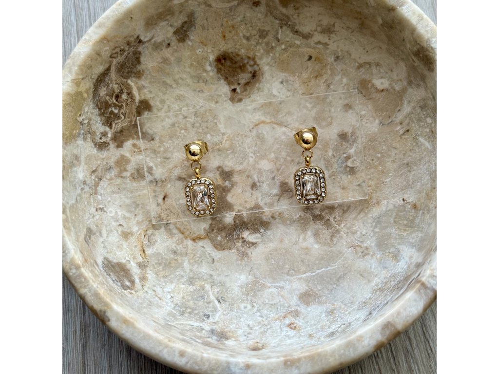 Shine Bar jsou náušnice ve zlatém tónu s obdélníkovým přívěskem a třpytivými kamínky. Hodí se na každodenní nošení i na večer.